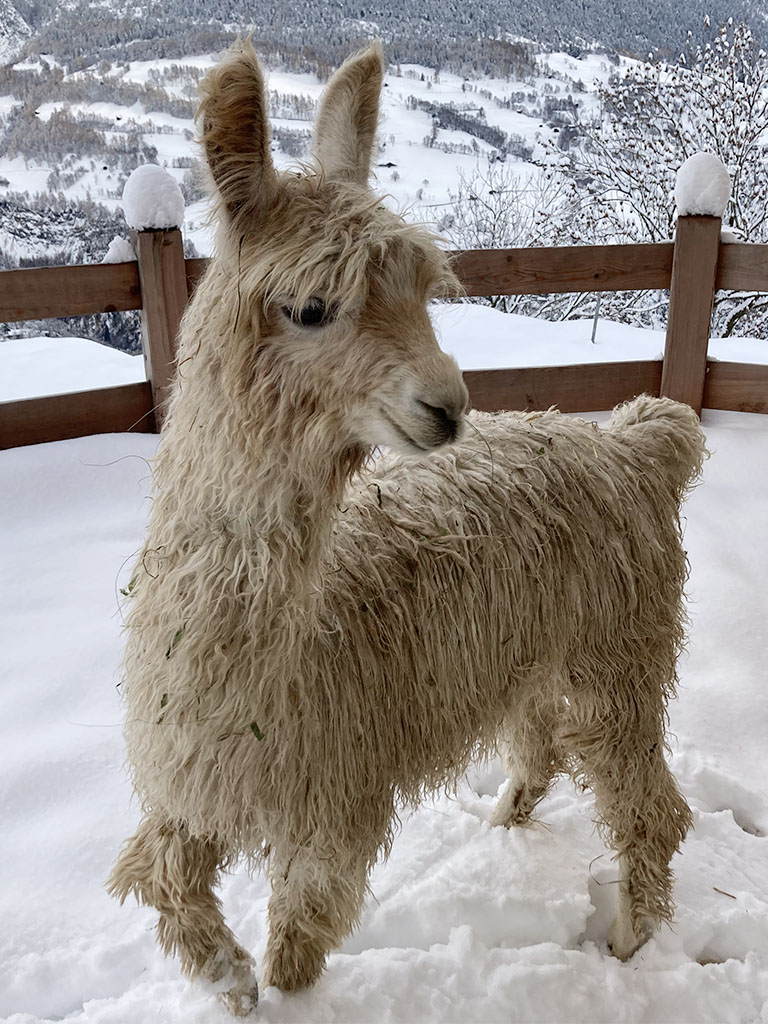 «Schon in der Zeit zur Ausbildung als Polygrafin wusste ich, dass ich nach meiner Lehrzeit nach Südamerika reisen wollte, um die Andenbewohner mit ihren Lamas kennenzulernen. Peru hatte es mir angetan und ich lebte und arbeitete auch einige Jahre dort. Immer wieder zog es mich in die weite Welt hinaus und ich bereiste verschiedene Länder. Wieder zurück in der Schweiz und sesshaft geworden, arbeitete ich in diversen Werbeagenturen und auch selbständig auf meinem Beruf. Dass ich nun hier im Wallis mit Elmar zusammen die anmutigen Suri Lamas hege und pflege, ist umso schöner. So begleitet mich täglich ein Stück Südamerika mit dem ich immernoch sehr verbunden bin.» Simona Mink